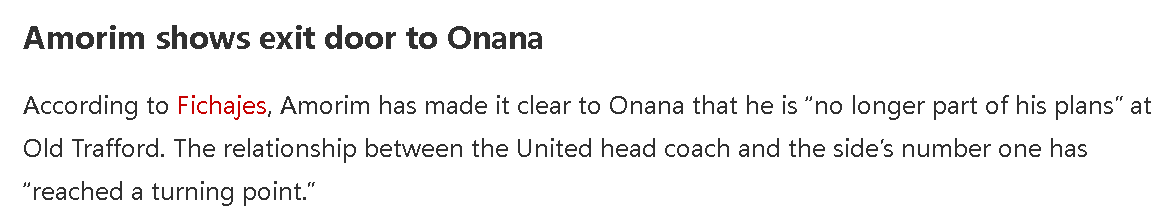Huấn luyện viên của Manchester United Ruben Amorin đã trực tiếp loại trừ thủ môn Cameroon 29 tuổi Andre Onana khỏi đội hình trong trận thua 0-1 trước Arsenal, với lý do chính thức là anh không tham gia vào bất kỳ trại huấn luyện nào và các trận đấu khởi động. Tuy nhiên, "Mạng lưới chuyển nhượng Fichajes" của Tây Ban Nha nói rằng huấn luyện viên Quỷ đỏ đã xác định rằng Onana không phải là thành viên của kế hoạch dài hạn cho tương lai.