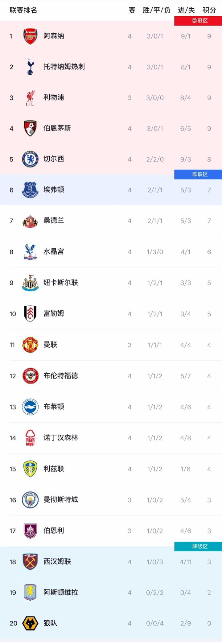 Hupu ngày 14 tháng 9, tất cả các trò chơi đã kết thúc vào ngày đầu tiên của vòng thứ tư của Premier League. Kết quả của 8 trận là: West Ham United 0-3 Tottenham Hotspur, Brentford 2-2 Chelsea, Arsenal 3-0 Nottingham Forest, Newcastle 1-0 Wolves, Fulham 1-0 Leeds United, Everton 0-0 Villa, Crystal Palace 0-0 Sunderland và Bournemouth 2-1 Brightton.