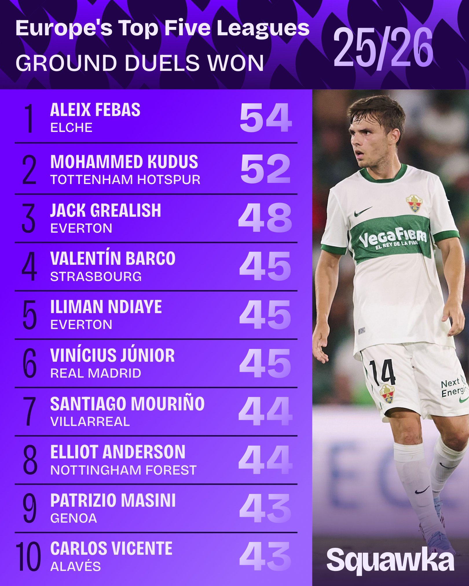 Hupu, ngày 16 tháng 10: Theo thống kê của Squawka, đội đầu bảng giành chiến thắng ở 5 giải đấu lớn tính đến thời điểm hiện tại của mùa giải này, tiền vệ Fabas của Elche đứng đầu, tiếp theo là Kudus và Grealish.