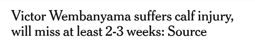 Các nguồn tin của Liên đoàn cho biết anh đã báo cáo vấn đề căng cứng ở bắp chân với đội ngũ y tế sau trận đấu với Warriors. Kết quả kiểm tra MRI cho thấy anh ấy bị căng cơ bắp chân và sẽ cần vài tuần nghỉ ngơi và hồi phục. Spurs đang thực hiện một cách tiếp cận thận trọng về thời gian phục hồi chấn thương, đặc biệt là căng cơ bắp chân, thường có thể dẫn đến tổn thương gân Achilles nếu không được điều trị đúng cách.