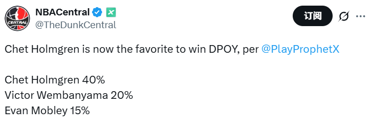 Cựu cầu thủ số 1 21 tuổi ghi trung bình 26,2 điểm mỗi trận trong mùa giải này, đồng thời dẫn đầu giải đấu với 10,9 rebounds và 3,6 block mỗi trận. Mùa trước, anh đã bỏ lỡ 30 trận cuối cùng của mùa giải do cục máu đông ở vai, từ đó bỏ lỡ cơ hội được bầu là Cầu thủ phòng ngự của năm (DPOY). Bây giờ, không lâu sau khi mùa giải này bắt đầu, anh lại gặp phải vấn đề chấn thương. Liệu anh ấy có bỏ lỡ DPOY lần nữa do không xuất hiện đủ không? Ít nhất hiện tại, xác suất chiến thắng của anh ấy (20%) đã tụt xuống vị trí thứ hai. Vị trí đầu tiên là Holmgren của Thunder (40%), và vị trí thứ ba là Mobley (15%).